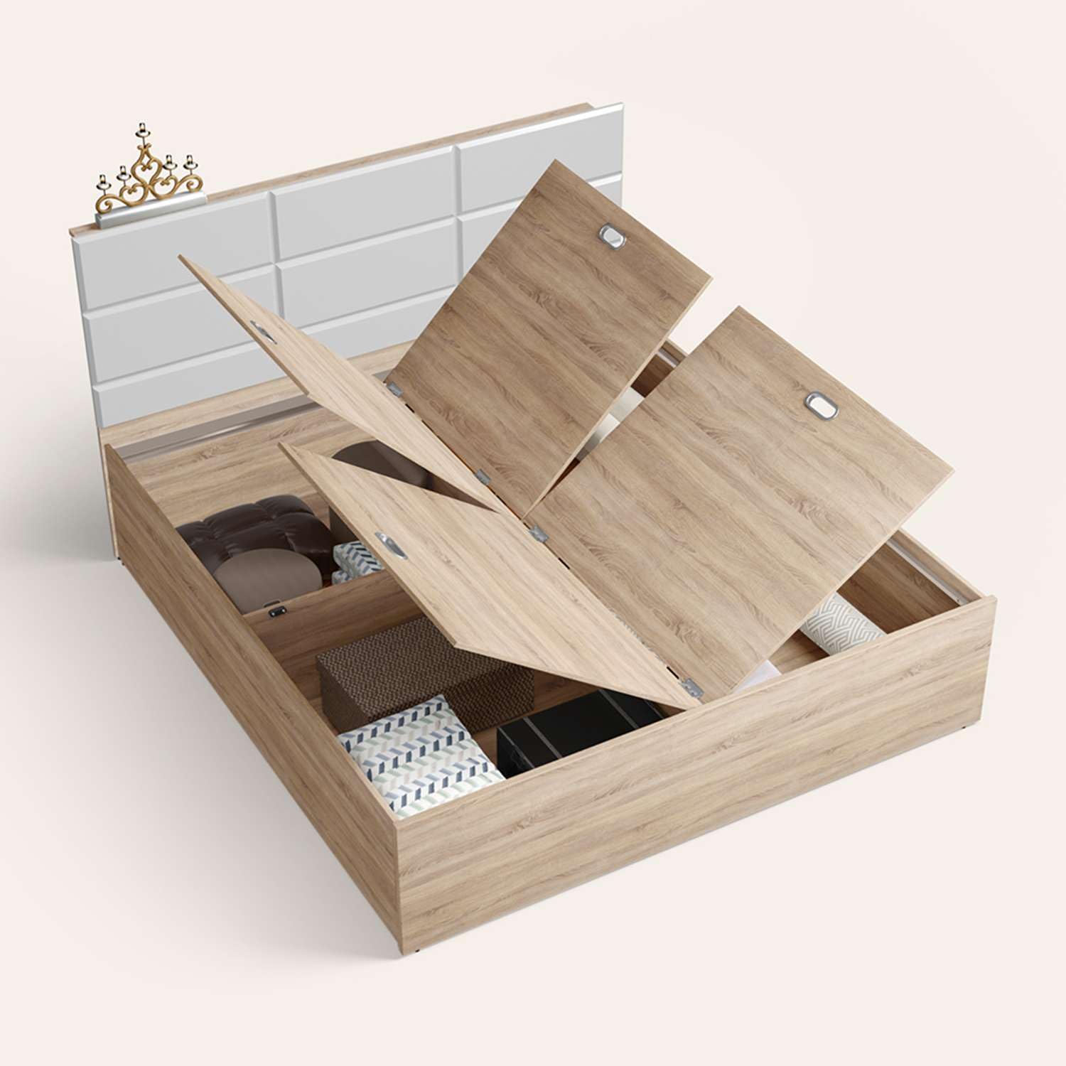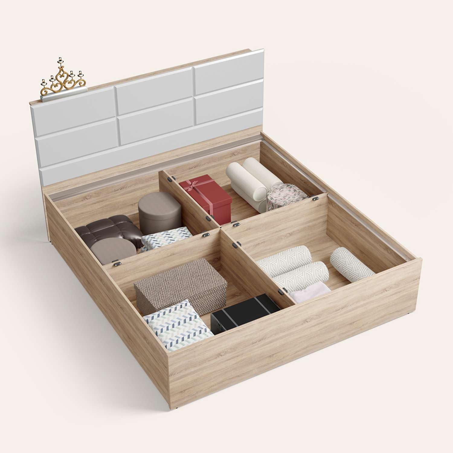 - Easy to access large storage space under the bed. Space in the headboard to keep smaller items.